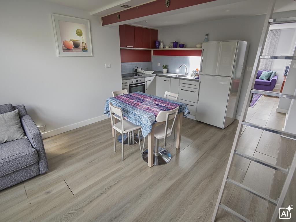 La camera da letto è dotata di armadi a muro, garantendo ampio spazio per i tuoi effetti personali. Il servizio finestrato assicura una buona ventilazione e luce naturale. Un piccolo soppalco nel soggiorno offre un posto letto aggiuntivo, perfetto per ospiti occasionali e un pratico ripostiglio. Inoltre, l'appartamento dispone di un parcheggio privato scoperto.