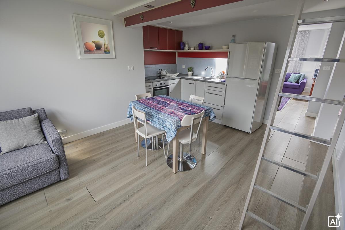 Das Schlafzimmer ist mit Einbauschränken ausgestattet und bietet ausreichend Platz für Ihre Sachen. Der Fensterservice sorgt für gute Belüftung und natürliches Licht. Ein kleiner Dachboden im Wohnzimmer bietet ein zusätzliches Bett, perfekt für gelegentliche Gäste und einen praktischen Abstellraum. Darüber hinaus verfügt die Wohnung über einen privaten Parkplatz im Freien.